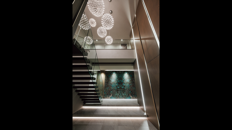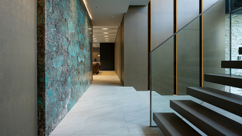 エントランスの正⾯の壁にはエメラルドグリーンとターコイズブルーの天然⽯を配置。縦貫に重厚感と、⼼地よい緊張感を⽣み出しています。