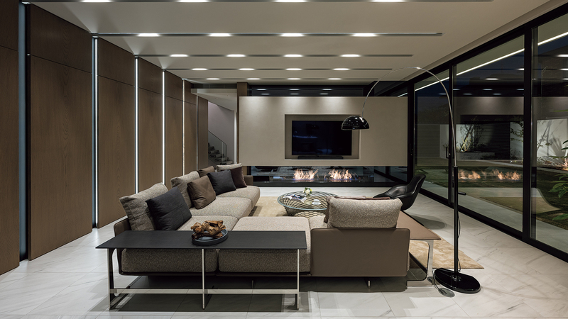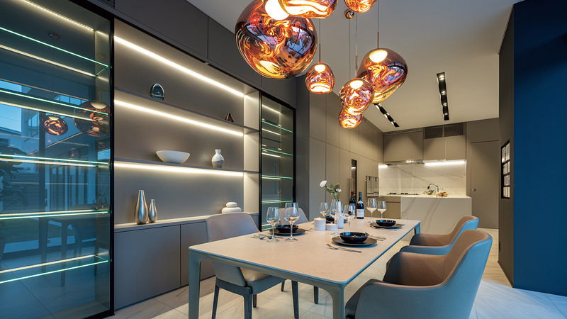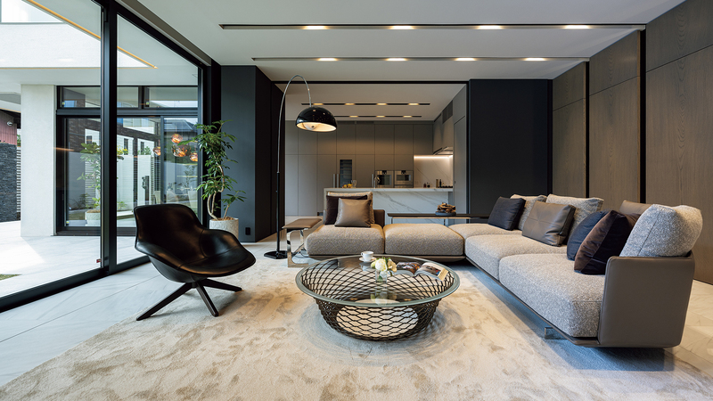 リビング・ダイニングの床はタイル張りとし、グレーをメインとした⾊構成でスタイリッシュにまとめています。中庭からの外光の変化が空間の表情を変えていきます。