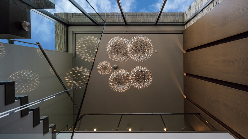 天井までの吹き抜けを持つエントランス。ガラスの⼿すりを持つストリップ階段とすることで軽やかな印象とし、かつ、外光を最⼤限取り込んでいます。