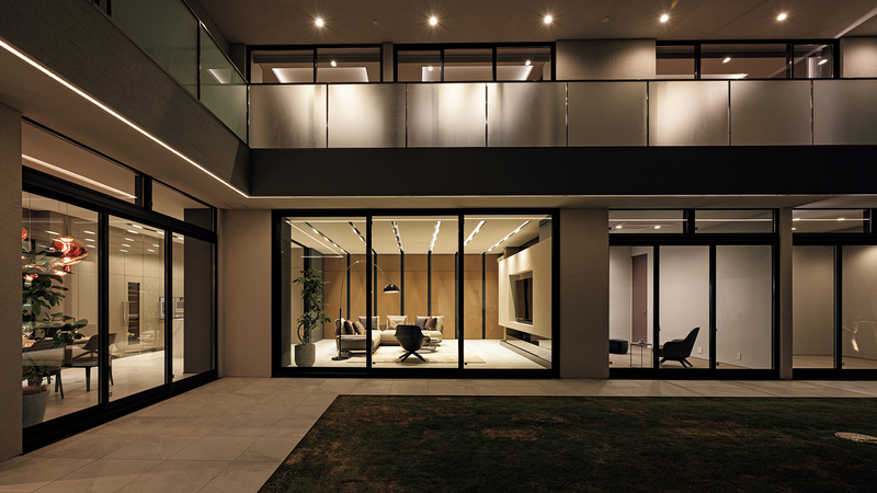 すべての居室が⾯する中庭の⾵情。⼣刻には、⼤きな開⼝を通して室内の空間が浮かび上がり、連続した空間のような広がりを感じることができます。