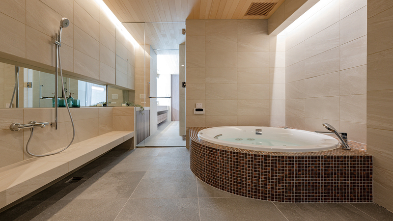 開放感を得るため、ルーフバルコニーに⾯して設けた明るいバスルーム。ジャグジーを備え、家族が同時に利⽤できる広さを確保している。