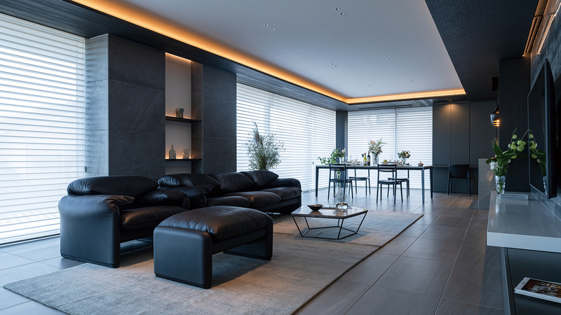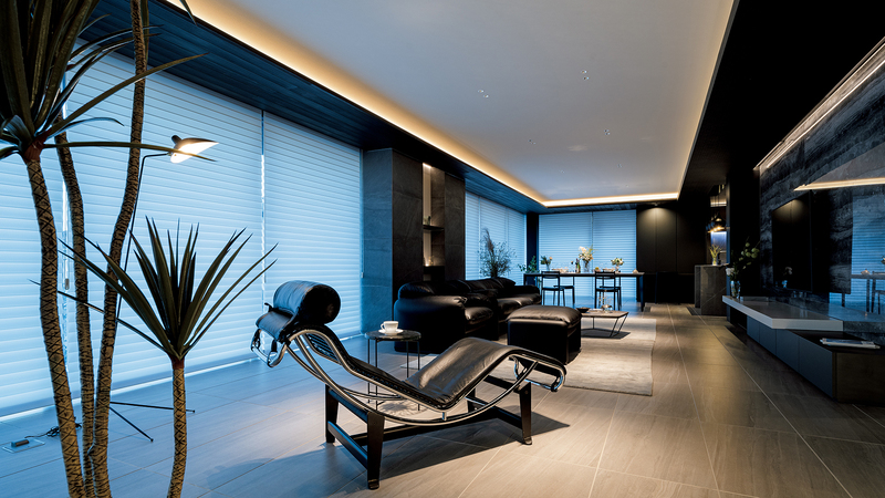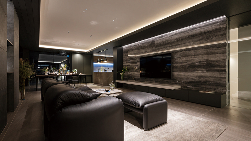 軽やかな印象の⽯材、全⾯⽩の天井としながら、壁⾯に⿊系の⽯材、天井の⼀部も⿊の⽊材で縁取ることにより、全体の印象を引き締めたリビング・ダイニング。