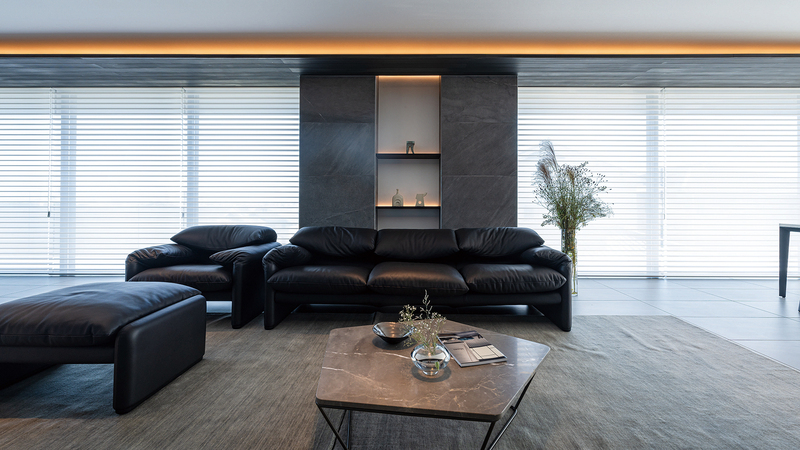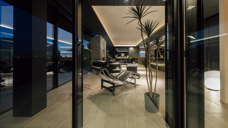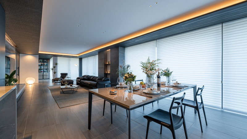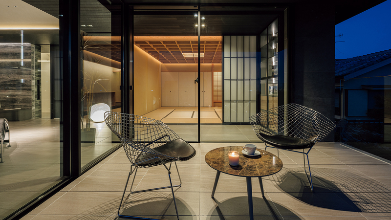 リビング・ダイニング、和室に⾯するインナーテラス。⿊で統⼀されたガラスの枠が、空間を引き締める役割を果たし、オープンな場をスタイリッシュに演出しています。