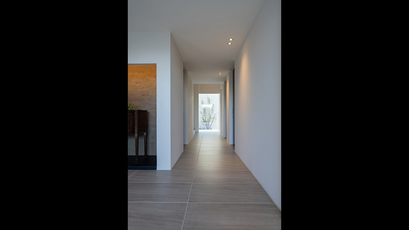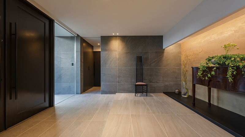 マットで、グレイッシュな⽯張りで構成されたエントランス・ホール。シンプルでモダンな落ち着きのある空間となっています。