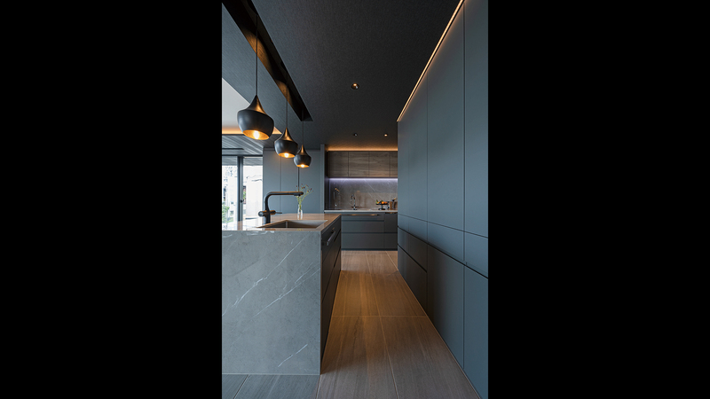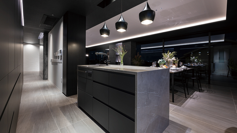 ダイニングに隣接するオープンキッチンも、⿊とグレーを基調とし、フロアの空間全体に⾃然に溶け込むよう計画されています。