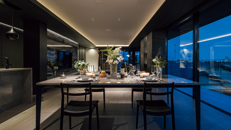 夜のとばりが迫るダイニング。⽩い天井の明度が下がると、⽇中とは異なる、シックで落ち着いた空間が姿を表します。