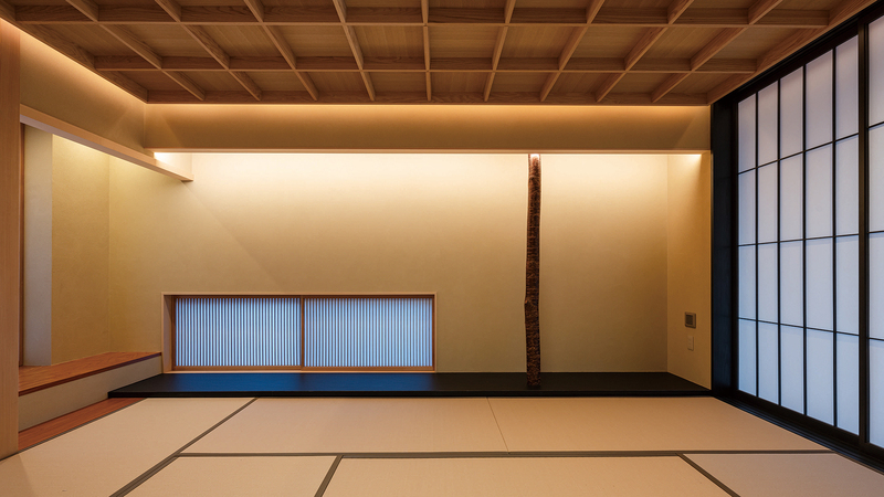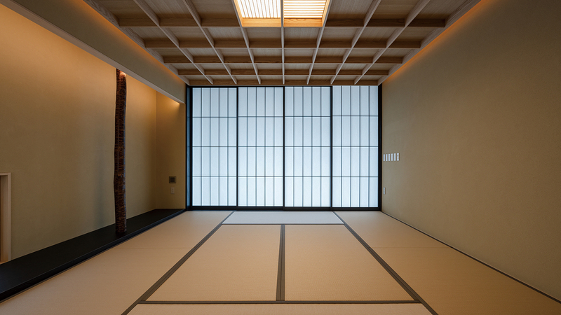 格天井や地窓を現代⾵にアレンジして構成した和室。伝統的な和の空間要素を踏襲しながら、凛とした気品を感じさせてくれます。
