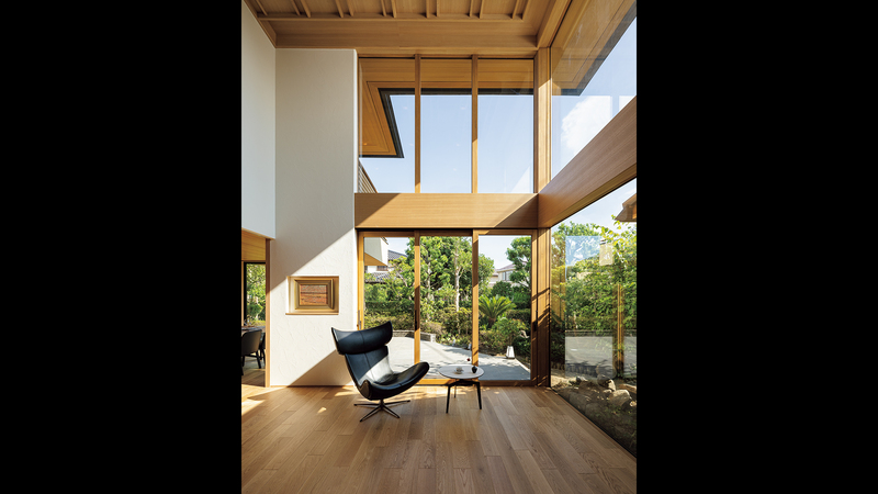 2層吹き抜けの⼤きな開⼝から、愛着のある庭⽊をゆったりと眺められるようになっています。⽩壁と⽊の構成が、和の空間をイメージさせます。