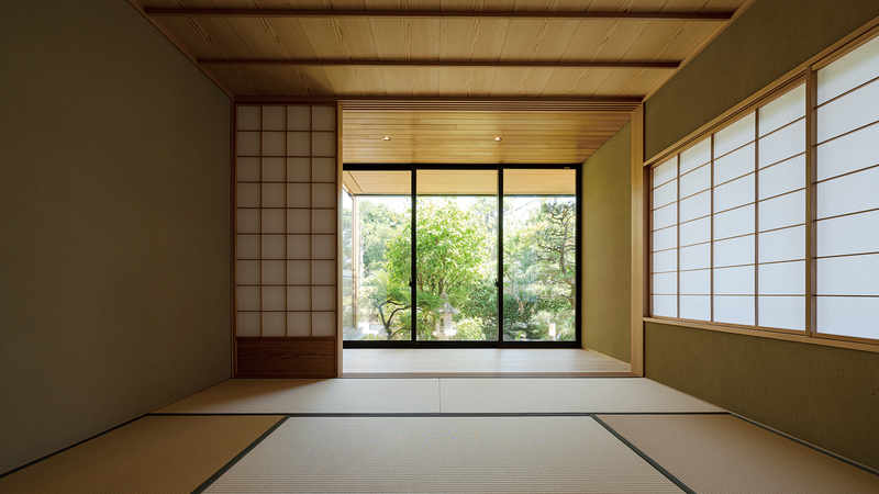 和室は、ごくシンプルな正統派のつくりとしながら、障⼦⼾を開けると、⻑年にわたって守ってきた庭が借景として浮かび上がる仕掛けとなっています。