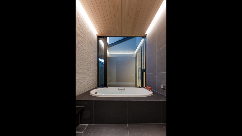 全⾯開⼝を持つバスルームは、天井の⽊、壁⾯のタイルと⽯張りという、⾊も質感も異なる素材を組み合わせた、遊び⼼のある仕様となっています