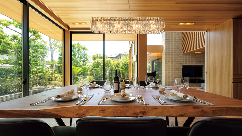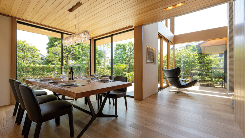 天井を抑えた、落ち着きのあるダイニングからは、軒の出越しに⽊々の緑を望みます。⼤きく張り出した軒が直射⽇光を遮ります。