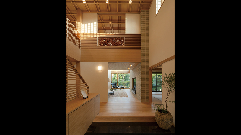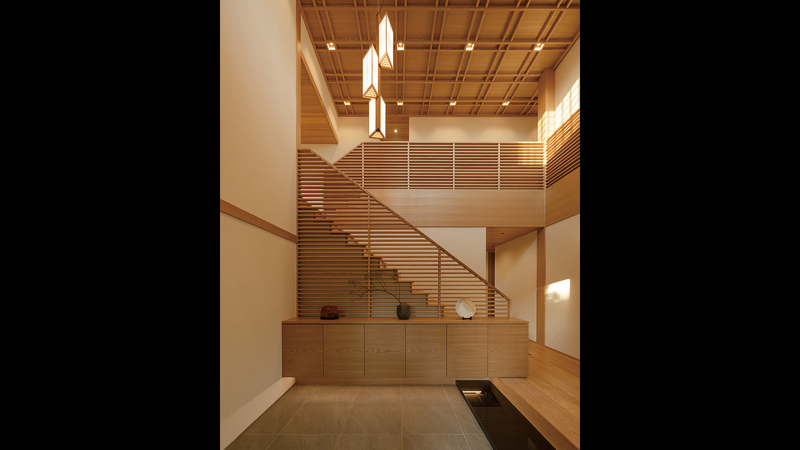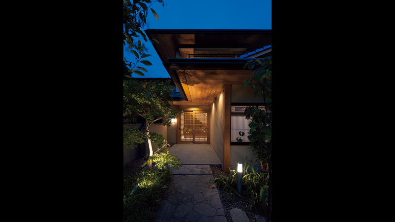 軒の下をくぐり抜け、路地を⾏くような⾵情のアプローチ。和⾵建築ならではの、しっとりとした⾵情が漂います。