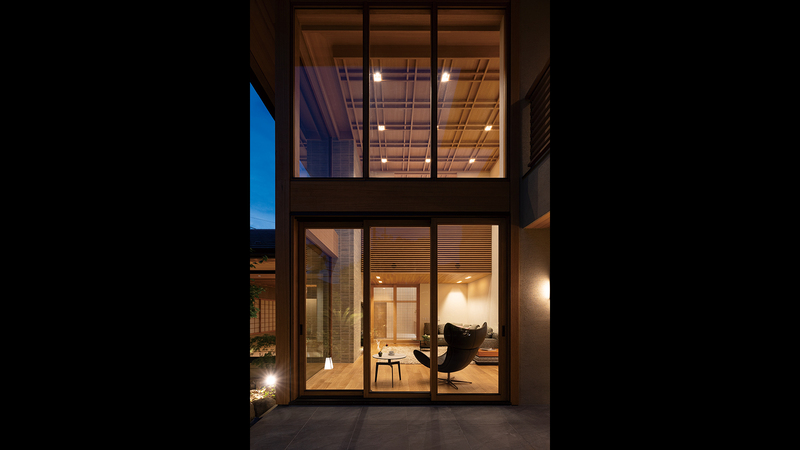外部から⾒たリビングの⼣景。格天井や横棧格⼦の壁⾯など、和のデザインと温かな⽊の⾊合いが、⼤きな開⼝に浮かび上がります。