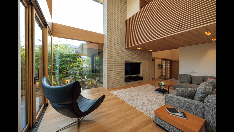 和的なデザインで設えた空間に、素材感のある焼き物タイルを部分的に取り込むことで、モダンな雰囲気となっているリビング。