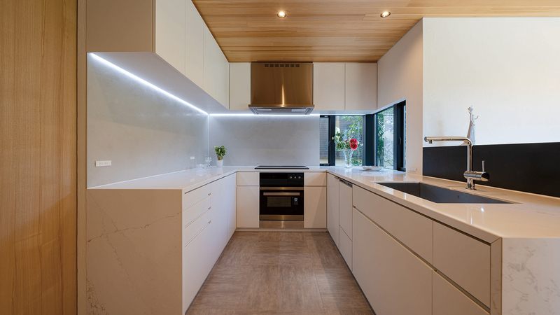 キッチンは、⽊の天井、建具を取り⼊れながらも、⽩を基調として、使い勝⼿を優先したシンプルで清潔感のあるデザインとなっています。