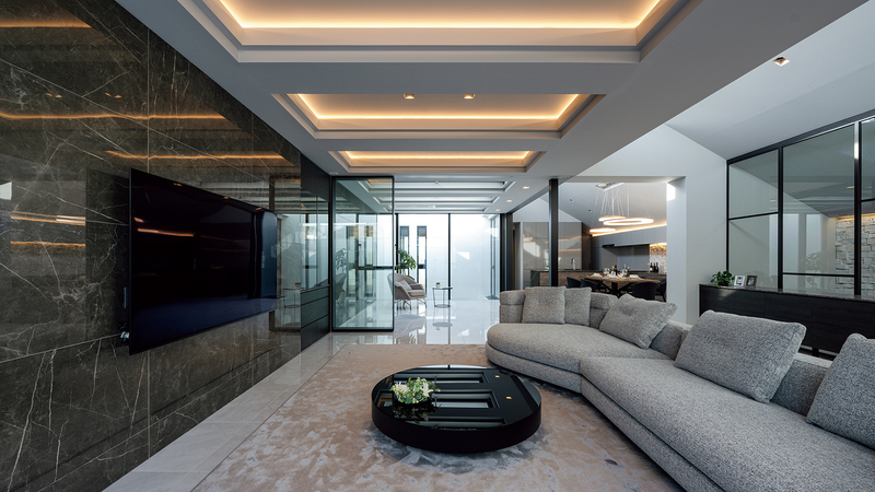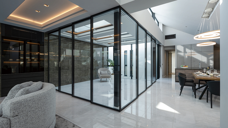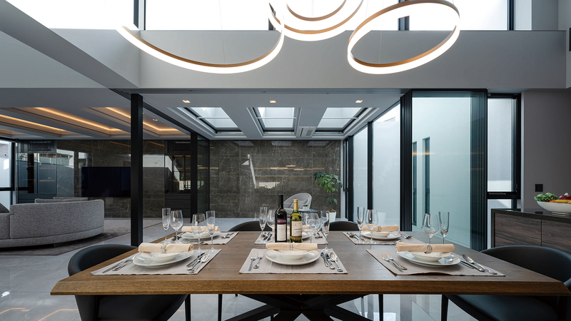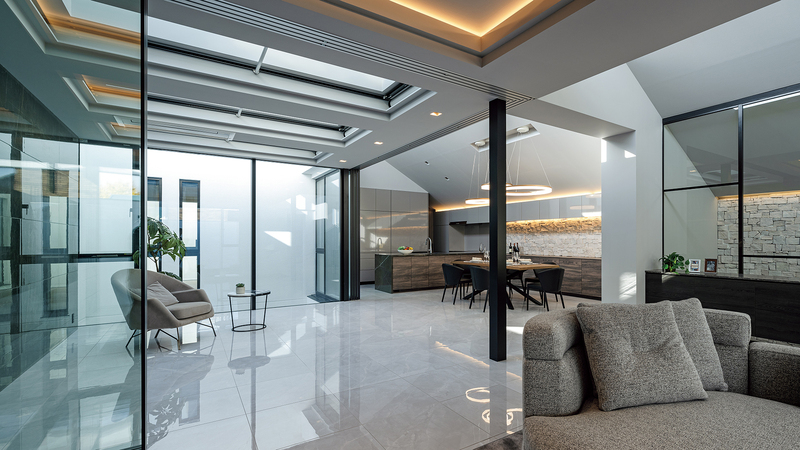 リビング・ダイニングに隣接するインナーテラス。ガラスで仕切られたそのスペースを空間的に取り込むことにより、実際以上に広々とした印象を⽣み出しています。