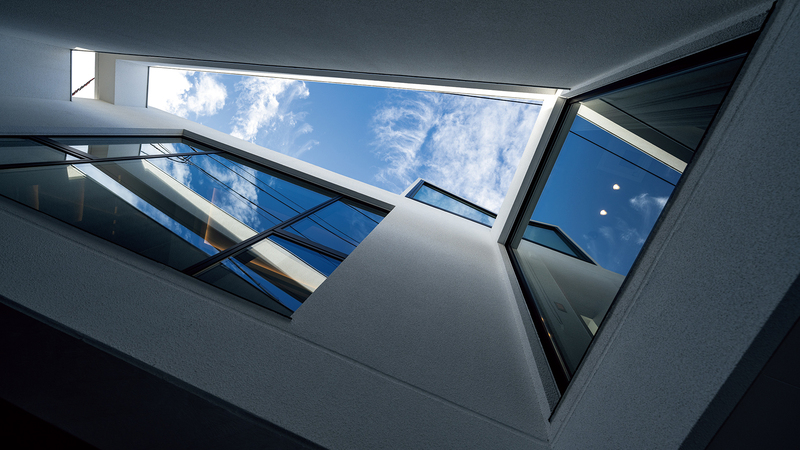 外光をできるだけ内部空間に取り込むため、外壁の構成による光庭を設けています。切り取られた空の表情も、この住まいならではの景⾊として取り込んでいます。