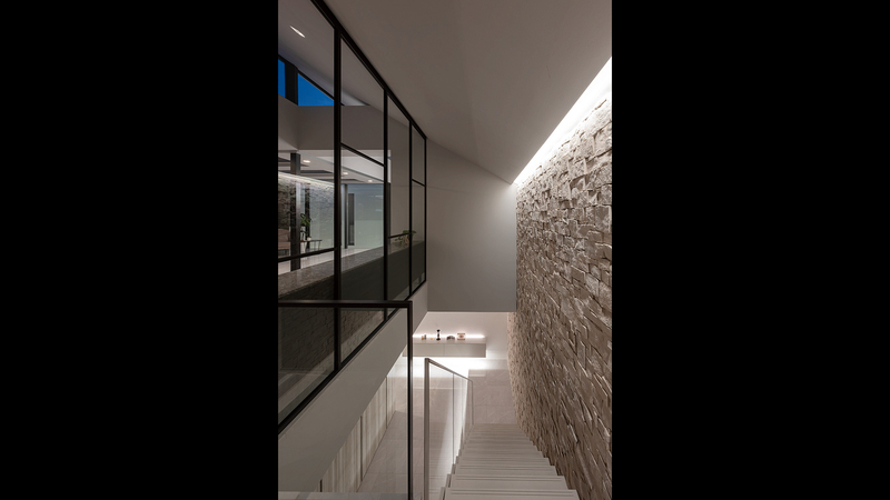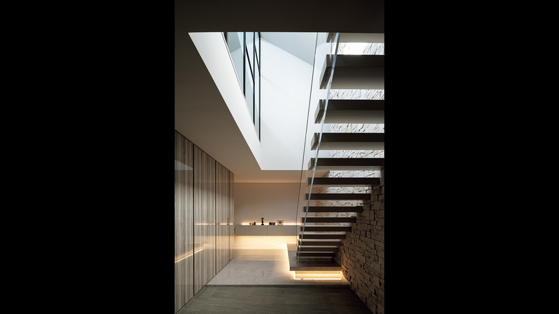 ⽇当たりのあまり良くない⽴地のなか、外壁の配置を⼯夫して室内に明るさをもたらすほか、階段室においては間接照明を活かし、淡く落ち着きのある雰囲気としています。
