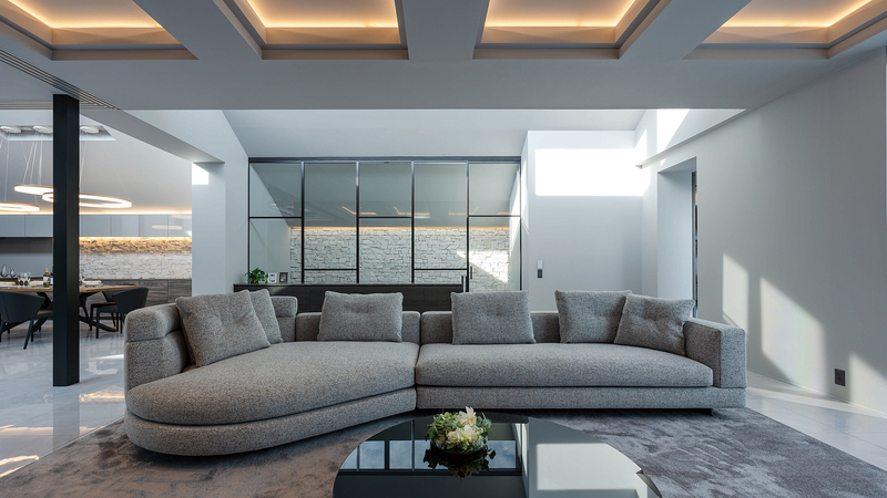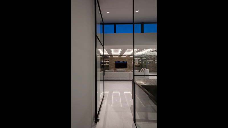 階段室からリビング⽅⾯を望む空間。扉を含めて全⾯ガラス張りの間仕切りとすることによって⼀体となった印象を与え、⽣活のメインの空間に開放感をもたらしています。