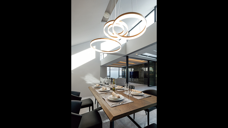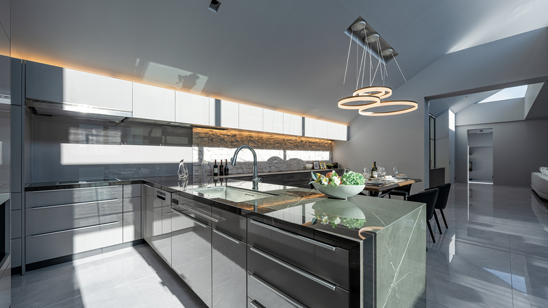 リビングから続くダイニング・キッチンにも、⼤きなハイサイドライトから外光が降り注ぎます。時刻によってその表情が変化することで、暮らしにリズムを与える仕掛けでもあります。